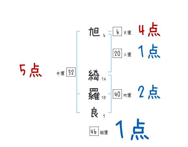 天運![]() | 旭綺羅良さんの天運は6画の4つ星!慎重な努力家で信頼を得る。誠実な精神で向上心に優れる。 家系が持つ宿命的な運勢を表します。祖先から受け継いだ苗字ですので自分の力が及びません。家柄を象徴します。 |