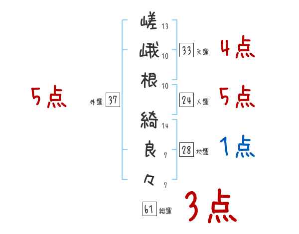 天運![]() | 嵯峨根綺良々さんの天運は33画の4つ星!権力志向でプライドが高い。勇気があり運を切り開き成功する。 家系が持つ宿命的な運勢を表します。祖先から受け継いだ苗字ですので自分の力が及びません。家柄を象徴します。 |