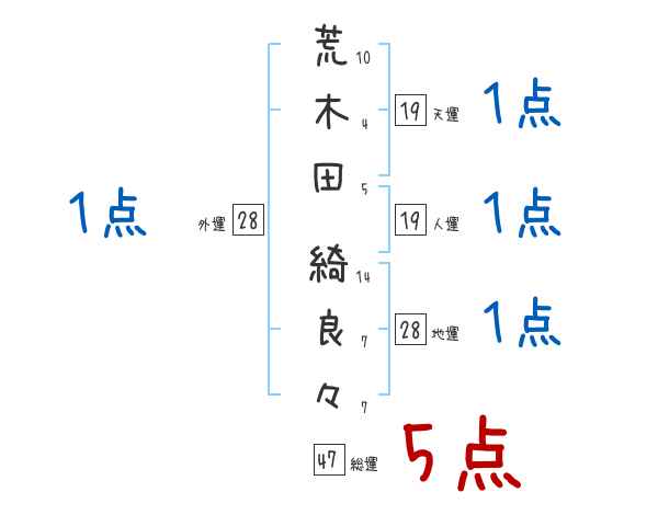 総運![]() | 荒木田綺良々さんの総運は47画の5つ星!実力が開花し発展する円満な人生。財に恵まれる。 あなたの人生を表す1番重要な運勢です。生涯を通じて影響する総合運となり、主に50歳以降の晩年期に影響を及ぼします。 |