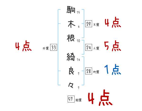 総運![]() | 駒木根綺良々さんの総運は57画の4つ星!向上心があり人望がある。地位を得る。 あなたの人生を表す1番重要な運勢です。生涯を通じて影響する総合運となり、主に50歳以降の晩年期に影響を及ぼします。 |