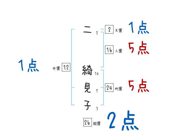 人運![]() | 二綺見子さんの人運は16画の5つ星!人望が厚く大きく発展する。逆転成功が見える。 性格や才能などを表す2番目に重要な運勢です。人間関係や協調性、社会的な成功に影響します。主に20歳から50歳ぐらいまでの中年期の運勢を表します。 |