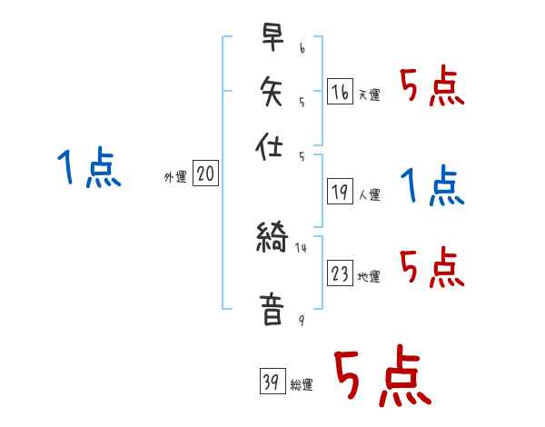 天運![]() | 早矢仕綺音さんの天運は16画の5つ星!人望が厚く大きく発展する。逆転成功が見える。 家系が持つ宿命的な運勢を表します。祖先から受け継いだ苗字ですので自分の力が及びません。家柄を象徴します。 |