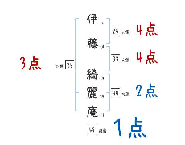 天運![]() | 伊藤綺麗庵さんの天運は25画の4つ星!個性があり才能があふれる。強運の持ち主で発展する。 家系が持つ宿命的な運勢を表します。祖先から受け継いだ苗字ですので自分の力が及びません。家柄を象徴します。 |