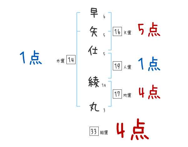 天運![]() | 早矢仕綾丸さんの天運は16画の5つ星!人望が厚く大きく発展する。逆転成功が見える。 家系が持つ宿命的な運勢を表します。祖先から受け継いだ苗字ですので自分の力が及びません。家柄を象徴します。 |