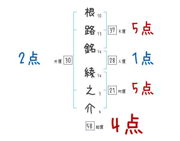総運![]() | 根路銘綾之介さんの総運は58画の4つ星!安定した生活。大器晩成タイプ。 あなたの人生を表す1番重要な運勢です。生涯を通じて影響する総合運となり、主に50歳以降の晩年期に影響を及ぼします。 |