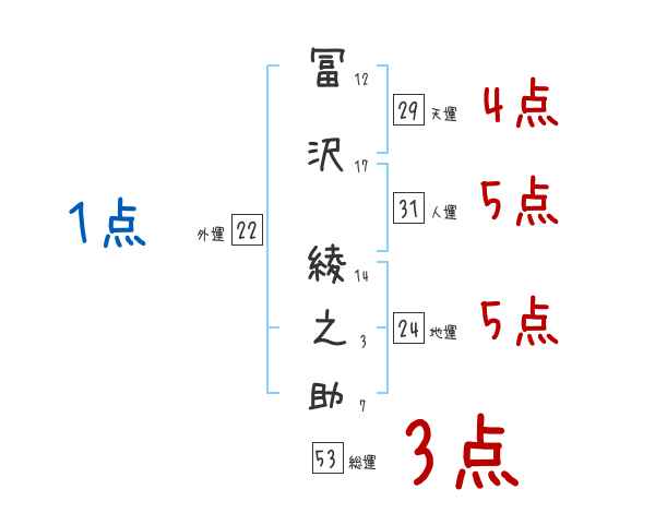 総運![]() | 冨沢綾之助さんの総運は53画の3つ星!やや見栄っ張りで虚栄心がある。散財に注意。 あなたの人生を表す1番重要な運勢です。生涯を通じて影響する総合運となり、主に50歳以降の晩年期に影響を及ぼします。 |