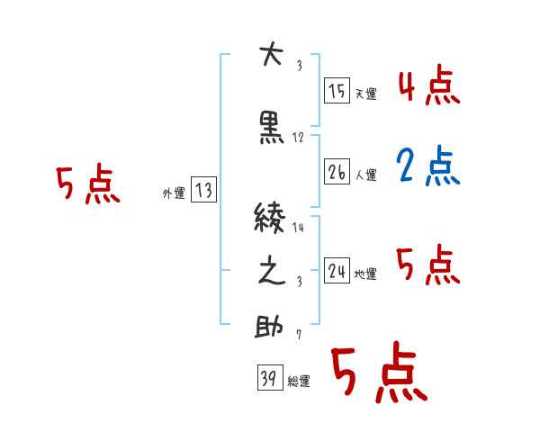 天運![]() | 大黒綾之助さんの天運は15画の4つ星!人徳があり出世する。順調に物事を進め円満な人生。 家系が持つ宿命的な運勢を表します。祖先から受け継いだ苗字ですので自分の力が及びません。家柄を象徴します。 |