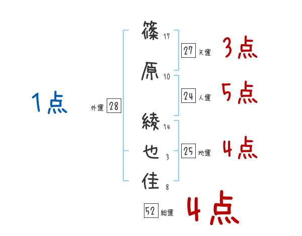外運![]() | 篠原綾也佳さんの外運は28画の1つ星!家庭環境に注意。スポーツで活躍できる能力があるかも。 生活面を象徴する運勢です。外部から受ける影響力を表し、結婚運、家庭運や職場、環境への順応性を表します。 |