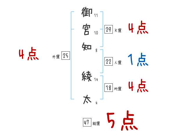 総運![]() | 御宮知綾太さんの総運は47画の5つ星!実力が開花し発展する円満な人生。財に恵まれる。 あなたの人生を表す1番重要な運勢です。生涯を通じて影響する総合運となり、主に50歳以降の晩年期に影響を及ぼします。 |