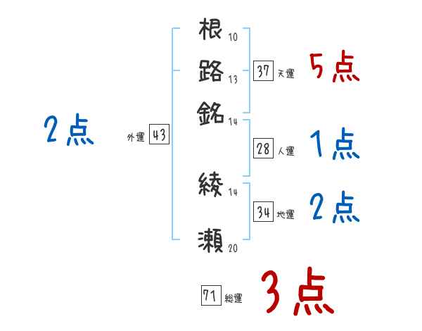 地運![]() | 根路銘綾瀬さんの地運は34画の2つ星!独創性に優れるが、自尊心が強く災難に注意しましょう。 個性を表す基礎的な運勢です。性格形成や対人関係、行動力など家庭環境に影響されます。主に誕生してから20歳くらいまでの若年期の運勢を表します。 |