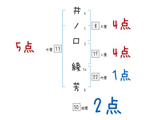 総運![]() | 井ノ口綾芳さんの総運は30画の2つ星!浮き沈みの激しさに注意しましょう。 あなたの人生を表す1番重要な運勢です。生涯を通じて影響する総合運となり、主に50歳以降の晩年期に影響を及ぼします。 |
