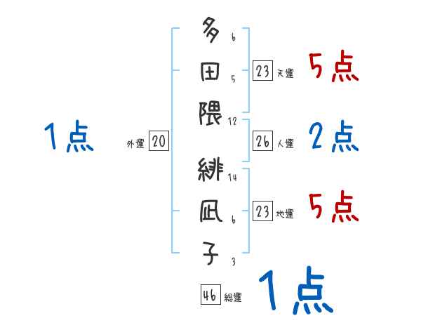 天運![]() | 多田隈緋凪子さんの天運は23画の5つ星!想像力に優れ活力がある。一代で成功し名誉を手に入れる。 家系が持つ宿命的な運勢を表します。祖先から受け継いだ苗字ですので自分の力が及びません。家柄を象徴します。 |