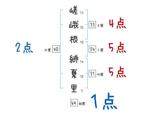 天運![]() | 嵯峨根緋夏里さんの天運は33画の4つ星!権力志向でプライドが高い。勇気があり運を切り開き成功する。 家系が持つ宿命的な運勢を表します。祖先から受け継いだ苗字ですので自分の力が及びません。家柄を象徴します。 |