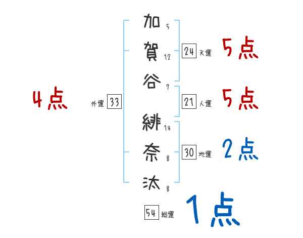 外運![]() | 加賀谷緋奈汰さんの外運は33画の4つ星!権力志向でプライドが高い。勇気があり運を切り開き成功する。 生活面を象徴する運勢です。外部から受ける影響力を表し、結婚運、家庭運や職場、環境への順応性を表します。 |