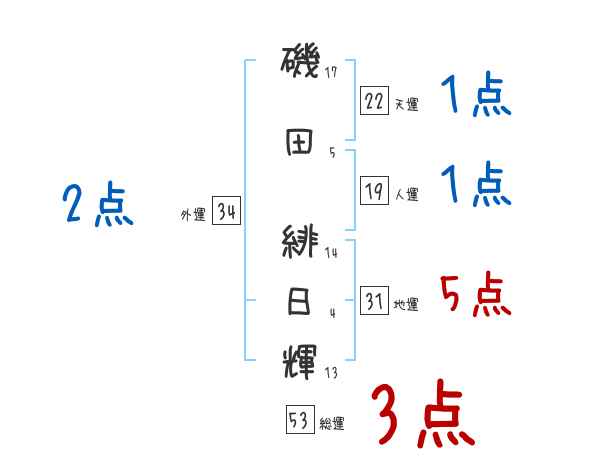 総運![]() | 磯田緋日輝さんの総運は53画の3つ星!やや見栄っ張りで虚栄心がある。散財に注意。 あなたの人生を表す1番重要な運勢です。生涯を通じて影響する総合運となり、主に50歳以降の晩年期に影響を及ぼします。 |