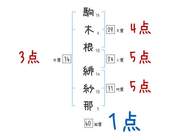 総運![]() | 駒木根緋紗那さんの総運は60画の1つ星!悲観的で迷いやすい。波乱が多く損をしないように。 あなたの人生を表す1番重要な運勢です。生涯を通じて影響する総合運となり、主に50歳以降の晩年期に影響を及ぼします。 |