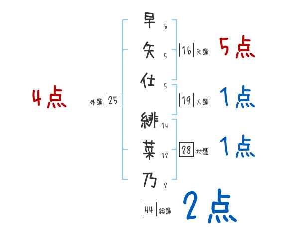総運![]() | 早矢仕緋菜乃さんの総運は44画の2つ星!誠実で慎重な性格。物事を考えすぎないように注意しましょう。 あなたの人生を表す1番重要な運勢です。生涯を通じて影響する総合運となり、主に50歳以降の晩年期に影響を及ぼします。 |