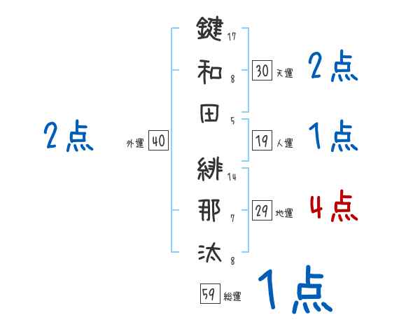 天運![]() | 鍵和田緋那汰さんの天運は30画の2つ星!浮き沈みの激しさに注意しましょう。 家系が持つ宿命的な運勢を表します。祖先から受け継いだ苗字ですので自分の力が及びません。家柄を象徴します。 |