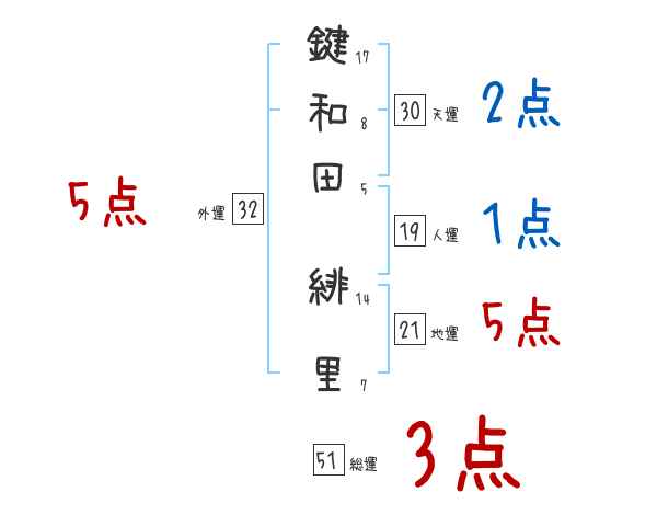 外運![]() | 鍵和田緋里さんの外運は32画の5つ星!柔軟性があり成功する。チャンスが多く金運が良い。 生活面を象徴する運勢です。外部から受ける影響力を表し、結婚運、家庭運や職場、環境への順応性を表します。 |