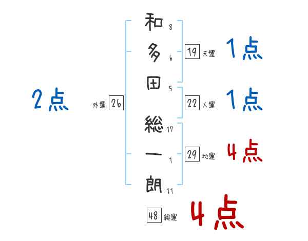 総運![]() | 和多田総一朗さんの総運は48画の4つ星!賢明な性格で人望が厚い。指導力があり多くの人に尊敬される。 あなたの人生を表す1番重要な運勢です。生涯を通じて影響する総合運となり、主に50歳以降の晩年期に影響を及ぼします。 |