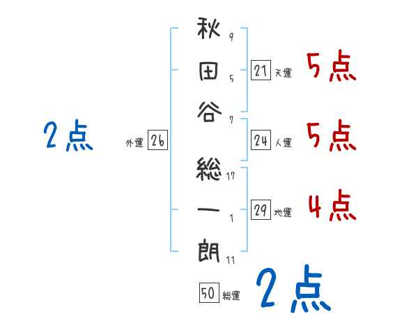 天運![]() | 秋田谷総一朗さんの天運は21画の5つ星!統率力がある。独立し成功する。名誉を手に入れる。 家系が持つ宿命的な運勢を表します。祖先から受け継いだ苗字ですので自分の力が及びません。家柄を象徴します。 |