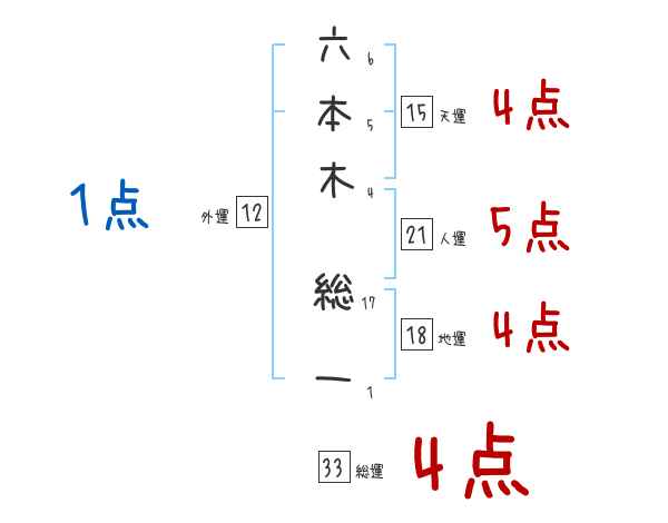 総運![]() | 六本木総一さんの総運は33画の4つ星!権力志向でプライドが高い。勇気があり運を切り開き成功する。 あなたの人生を表す1番重要な運勢です。生涯を通じて影響する総合運となり、主に50歳以降の晩年期に影響を及ぼします。 |