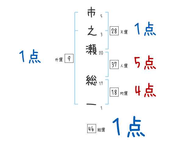 天運![]() | 市之瀬総一さんの天運は28画の1つ星!家庭環境に注意。スポーツで活躍できる能力があるかも。 家系が持つ宿命的な運勢を表します。祖先から受け継いだ苗字ですので自分の力が及びません。家柄を象徴します。 |