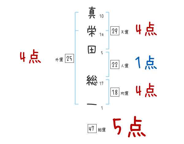 総運![]() | 真栄田総一さんの総運は47画の5つ星!実力が開花し発展する円満な人生。財に恵まれる。 あなたの人生を表す1番重要な運勢です。生涯を通じて影響する総合運となり、主に50歳以降の晩年期に影響を及ぼします。 |