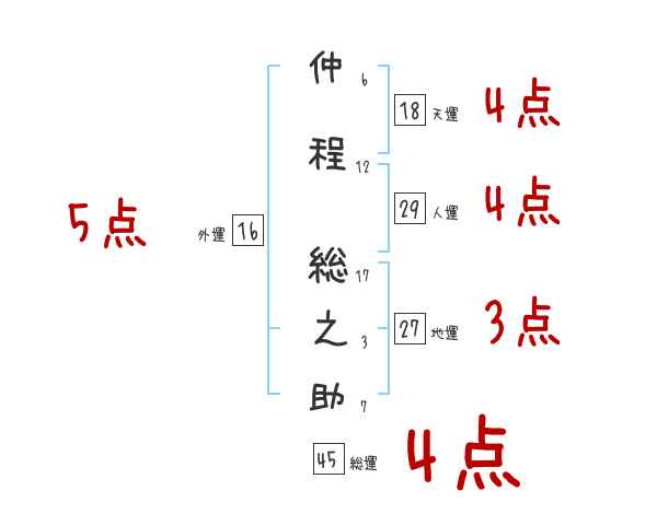 外運![]() | 仲程総之助さんの外運は16画の5つ星!人望が厚く大きく発展する。逆転成功が見える。 生活面を象徴する運勢です。外部から受ける影響力を表し、結婚運、家庭運や職場、環境への順応性を表します。 |