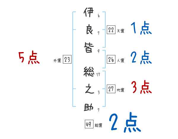 天運![]() | 伊良皆総之助さんの天運は22画の1つ星!努力することが苦手ないっぽう手先が器用。芸術性にも優れる。 家系が持つ宿命的な運勢を表します。祖先から受け継いだ苗字ですので自分の力が及びません。家柄を象徴します。 |