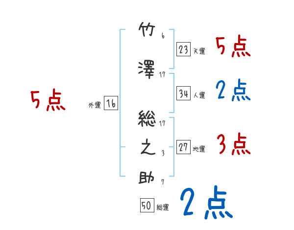 総運![]() | 竹澤総之助さんの総運は50画の2つ星!浮き沈みが激しく不安定。しりすぼみに衰退しやすいので注意しましょう。 あなたの人生を表す1番重要な運勢です。生涯を通じて影響する総合運となり、主に50歳以降の晩年期に影響を及ぼします。 |