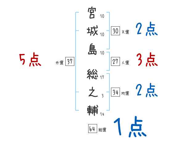 天運![]() | 宮城島総之輔さんの天運は30画の2つ星!浮き沈みの激しさに注意しましょう。 家系が持つ宿命的な運勢を表します。祖先から受け継いだ苗字ですので自分の力が及びません。家柄を象徴します。 |
