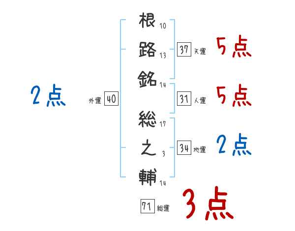 総運![]() | 根路銘総之輔さんの総運は71画の3つ星!力が弱く小心者だが、いずれ安泰を手に入れる。 あなたの人生を表す1番重要な運勢です。生涯を通じて影響する総合運となり、主に50歳以降の晩年期に影響を及ぼします。 |