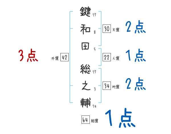 天運![]() | 鍵和田総之輔さんの天運は30画の2つ星!浮き沈みの激しさに注意しましょう。 家系が持つ宿命的な運勢を表します。祖先から受け継いだ苗字ですので自分の力が及びません。家柄を象徴します。 |