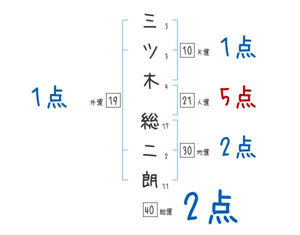 外運![]() | 三ツ木総二朗さんの外運は19画の1つ星!優れた才能を持ちますが、協調性が足りないことも。周りの人と協力する事を意識しましょう。 生活面を象徴する運勢です。外部から受ける影響力を表し、結婚運、家庭運や職場、環境への順応性を表します。 |
