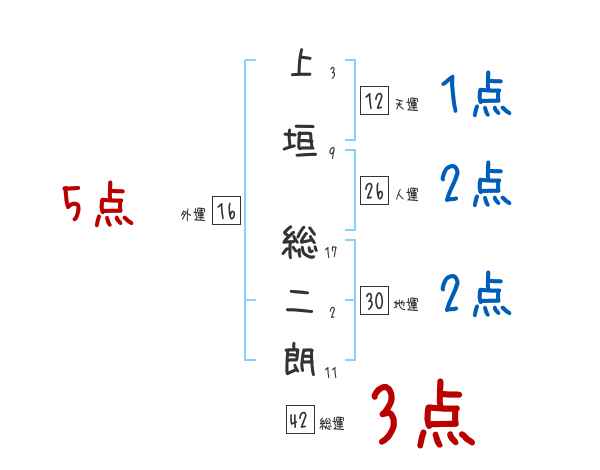 外運![]() | 上垣総二朗さんの外運は16画の5つ星!人望が厚く大きく発展する。逆転成功が見える。 生活面を象徴する運勢です。外部から受ける影響力を表し、結婚運、家庭運や職場、環境への順応性を表します。 |