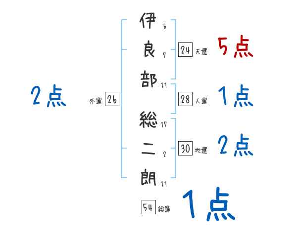 人運![]() | 伊良部総二朗さんの人運は28画の1つ星!家庭環境に注意。スポーツで活躍できる能力があるかも。 性格や才能などを表す2番目に重要な運勢です。人間関係や協調性、社会的な成功に影響します。主に20歳から50歳ぐらいまでの中年期の運勢を表します。 |