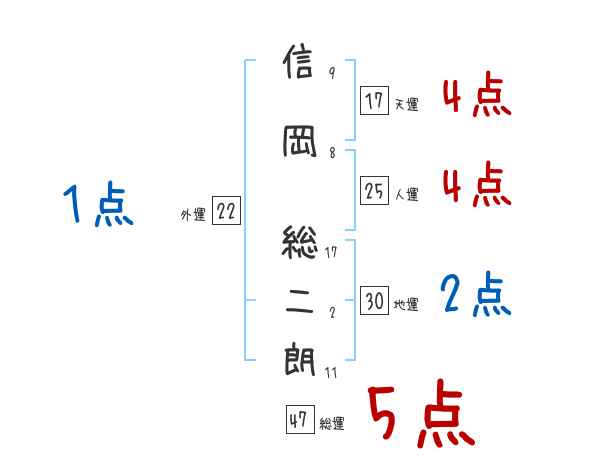 総運![]() | 信岡総二朗さんの総運は47画の5つ星!実力が開花し発展する円満な人生。財に恵まれる。 あなたの人生を表す1番重要な運勢です。生涯を通じて影響する総合運となり、主に50歳以降の晩年期に影響を及ぼします。 |