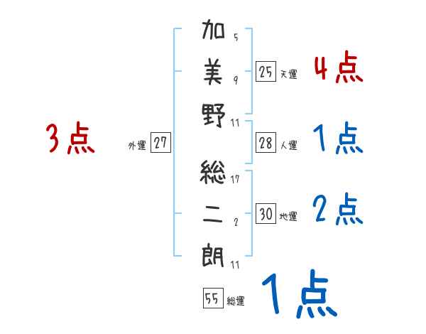 天運![]() | 加美野総二朗さんの天運は25画の4つ星!個性があり才能があふれる。強運の持ち主で発展する。 家系が持つ宿命的な運勢を表します。祖先から受け継いだ苗字ですので自分の力が及びません。家柄を象徴します。 |