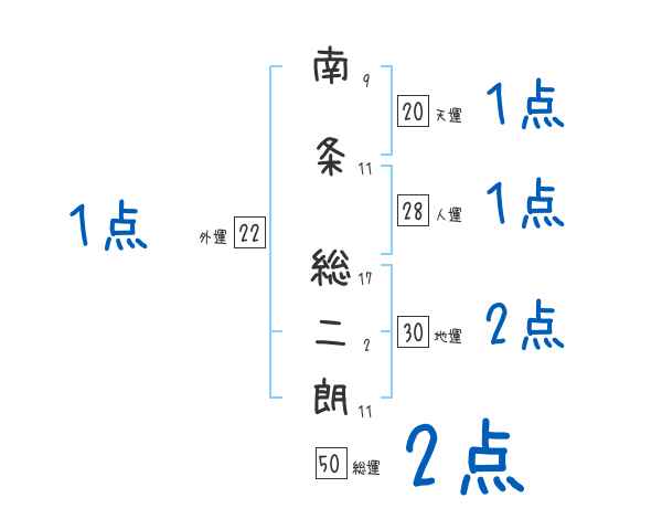 総運![]() | 南条総二朗さんの総運は50画の2つ星!浮き沈みが激しく不安定。しりすぼみに衰退しやすいので注意しましょう。 あなたの人生を表す1番重要な運勢です。生涯を通じて影響する総合運となり、主に50歳以降の晩年期に影響を及ぼします。 |