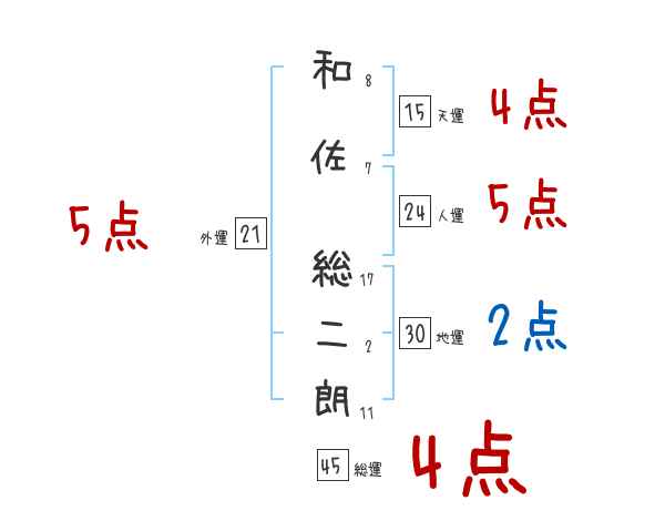 総運![]() | 和佐総二朗さんの総運は45画の4つ星!もくもくと物事を進め達成する。地味な努力家。 あなたの人生を表す1番重要な運勢です。生涯を通じて影響する総合運となり、主に50歳以降の晩年期に影響を及ぼします。 |