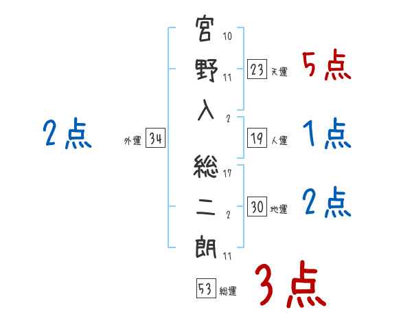 総運![]() | 宮野入総二朗さんの総運は53画の3つ星!やや見栄っ張りで虚栄心がある。散財に注意。 あなたの人生を表す1番重要な運勢です。生涯を通じて影響する総合運となり、主に50歳以降の晩年期に影響を及ぼします。 |