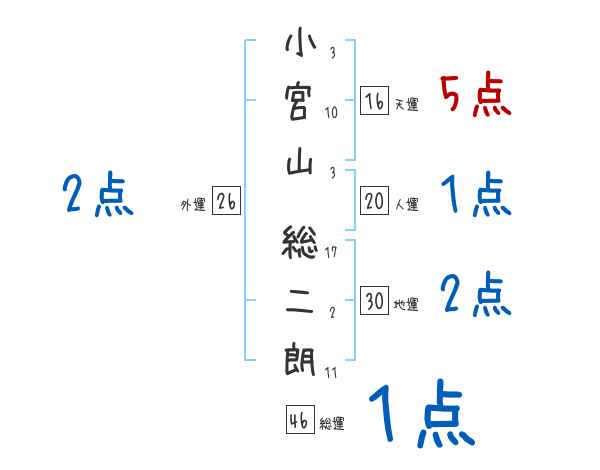 外運![]() | 小宮山総二朗さんの外運は26画の2つ星!波瀾万丈かも。信頼できる人を大事にしましょう。 生活面を象徴する運勢です。外部から受ける影響力を表し、結婚運、家庭運や職場、環境への順応性を表します。 |