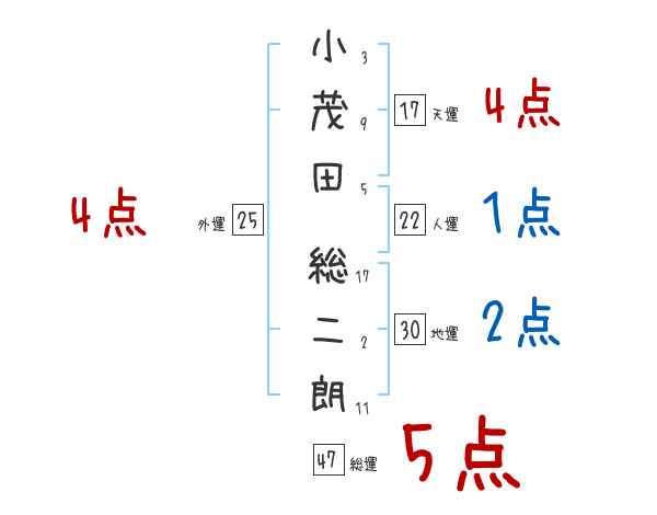 総運![]() | 小茂田総二朗さんの総運は47画の5つ星!実力が開花し発展する円満な人生。財に恵まれる。 あなたの人生を表す1番重要な運勢です。生涯を通じて影響する総合運となり、主に50歳以降の晩年期に影響を及ぼします。 |
