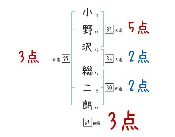 天運![]() | 小野沢総二朗さんの天運は31画の5つ星!社交性があり判断力に優れる。順風満帆な人生で円満な生活。 家系が持つ宿命的な運勢を表します。祖先から受け継いだ苗字ですので自分の力が及びません。家柄を象徴します。 |
