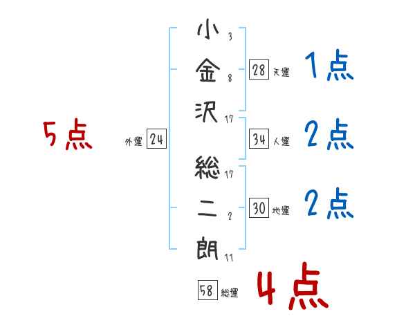総運![]() | 小金沢総二朗さんの総運は58画の4つ星!安定した生活。大器晩成タイプ。 あなたの人生を表す1番重要な運勢です。生涯を通じて影響する総合運となり、主に50歳以降の晩年期に影響を及ぼします。 |