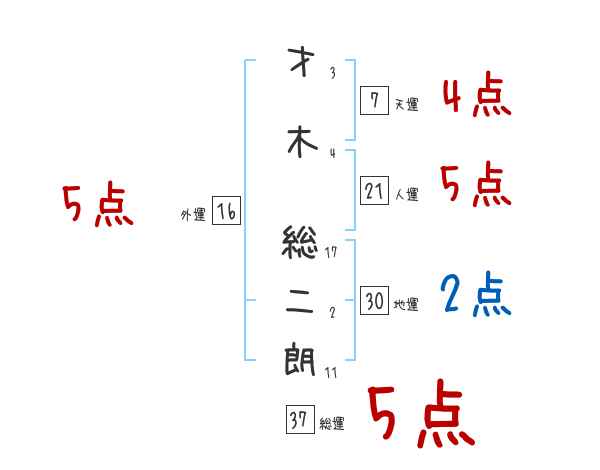 外運![]() | 才木総二朗さんの外運は16画の5つ星!人望が厚く大きく発展する。逆転成功が見える。 生活面を象徴する運勢です。外部から受ける影響力を表し、結婚運、家庭運や職場、環境への順応性を表します。 |