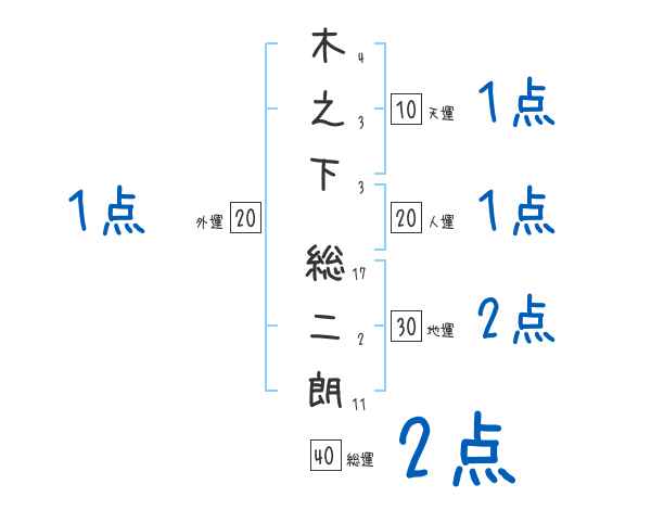 天運![]() | 木之下総二朗さんの天運は10画の1つ星!不安を感じやすい傾向。ストレスを抱えないように注意しましょう。 家系が持つ宿命的な運勢を表します。祖先から受け継いだ苗字ですので自分の力が及びません。家柄を象徴します。 |