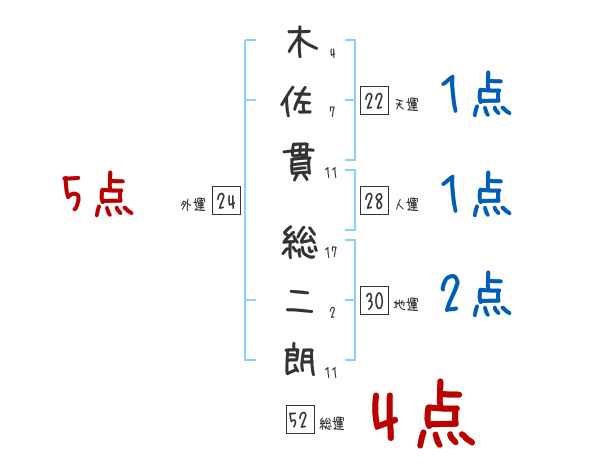 外運![]() | 木佐貫総二朗さんの外運は24画の5つ星!家庭運が良く順調な人生。金運にも恵まれる。 生活面を象徴する運勢です。外部から受ける影響力を表し、結婚運、家庭運や職場、環境への順応性を表します。 |