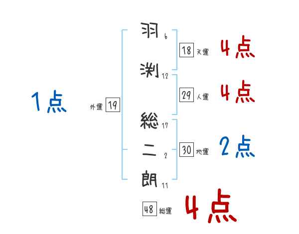 天運![]() | 羽渕総二朗さんの天運は18画の4つ星!情熱的で剛気。忍耐力があり信頼される。 家系が持つ宿命的な運勢を表します。祖先から受け継いだ苗字ですので自分の力が及びません。家柄を象徴します。 |